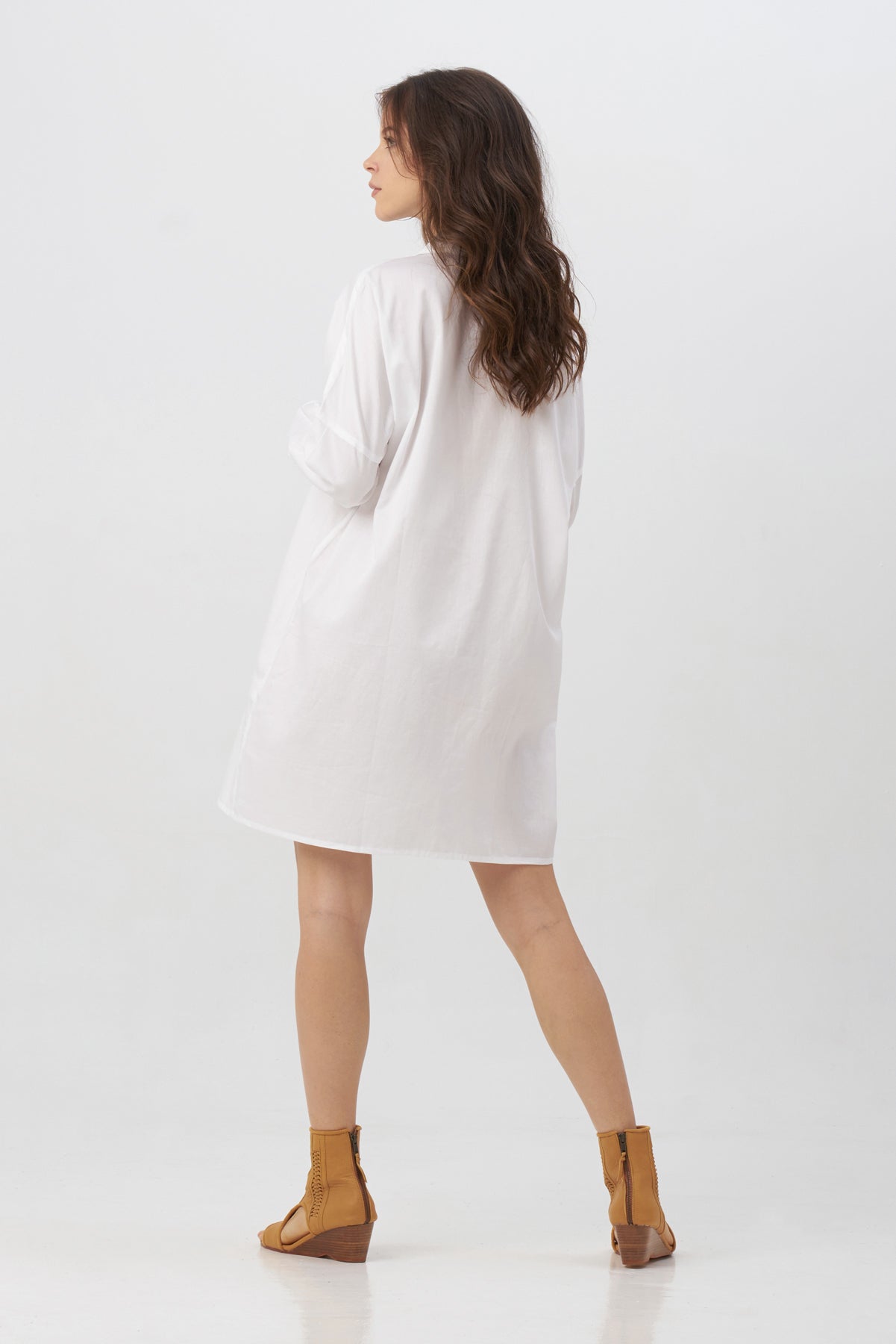 A cross between a tunic and a shirt, the Alana dress is all about keeping it casual. The soft, breezy fabric complements the relaxed silhouette of this dress. With subtle tailoring, it has narrow cuffs, a shirt collar, and contrasting buttons. It takes inspiration from loungewear to create an aesthetic that’s modern and super comfortable. Handmade and designed in Bali.