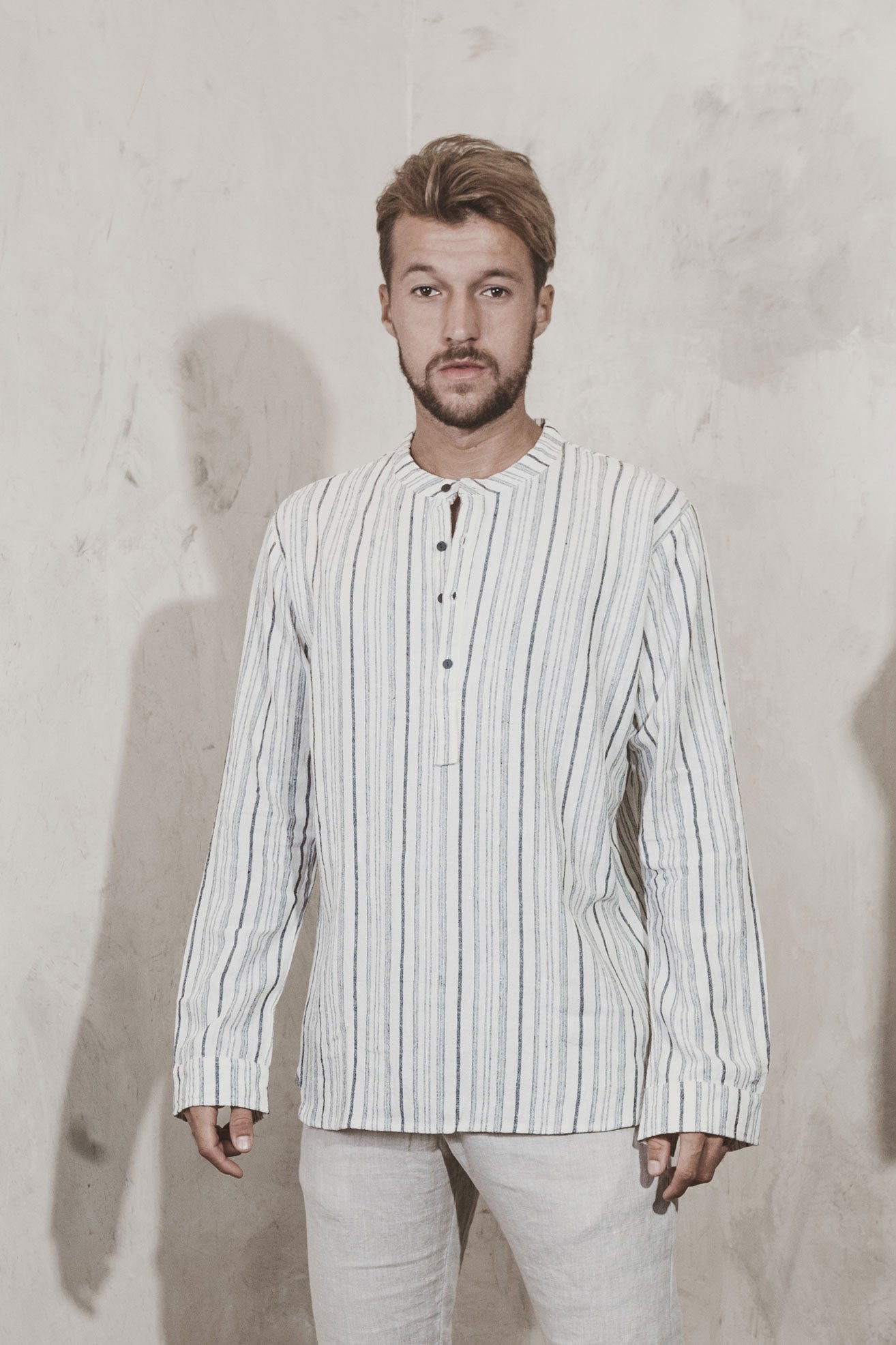 A casual shirt with a relaxed fit, created in a multi-stripe patterned fabric. With a flat collar, half placket, and straight hem, the shirt boasts a laidback vibe. The long, loose sleeves feature narrow buttoned cuffs. It can be ideal for vacations and casual evenings when paired with comfy cotton pants. Handmade and designed in Bali.