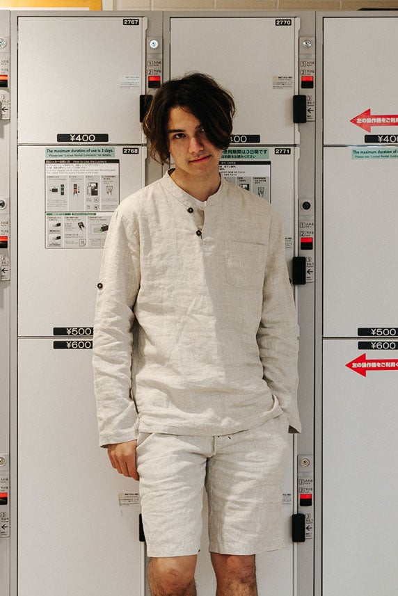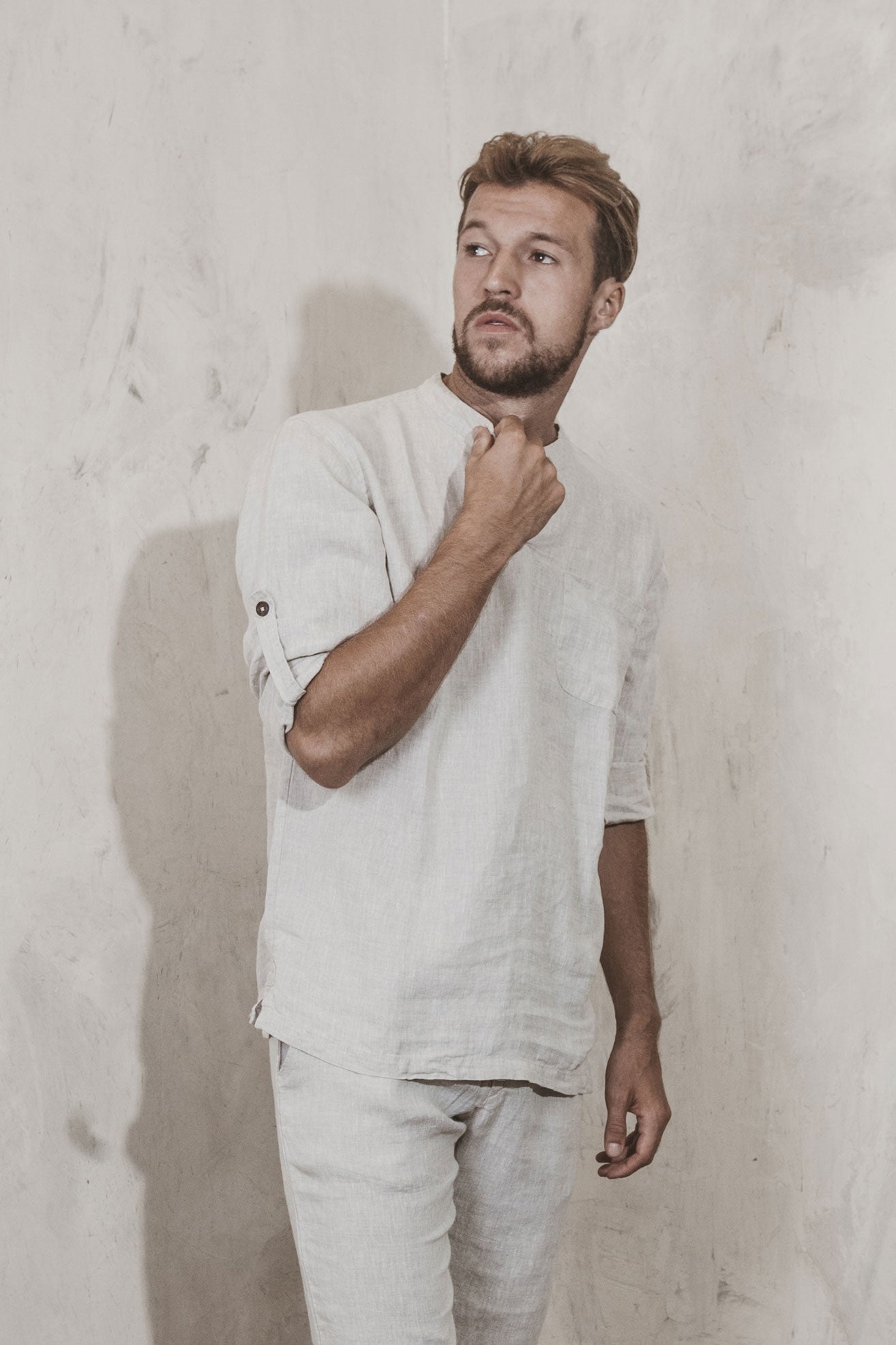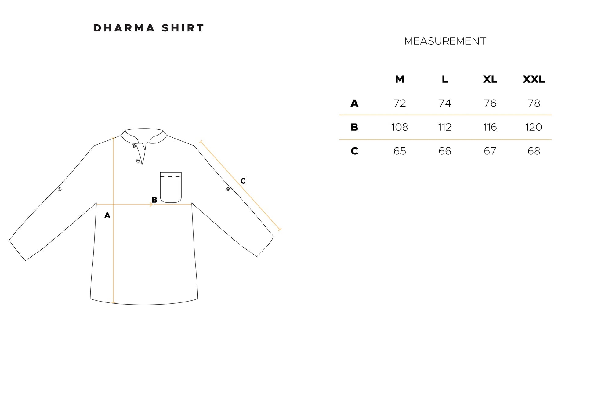 A minimalistic men’s long sleeve shirt with a comfortably loose fit. It has a flat collar with button loops and a pouch pocket on the front. The long sleeves have cuff straps and the hem has side slits. It can be paired with any kind of casual bottoms including cotton pants, jeans, and shorts. Handmade and designed in Bali.