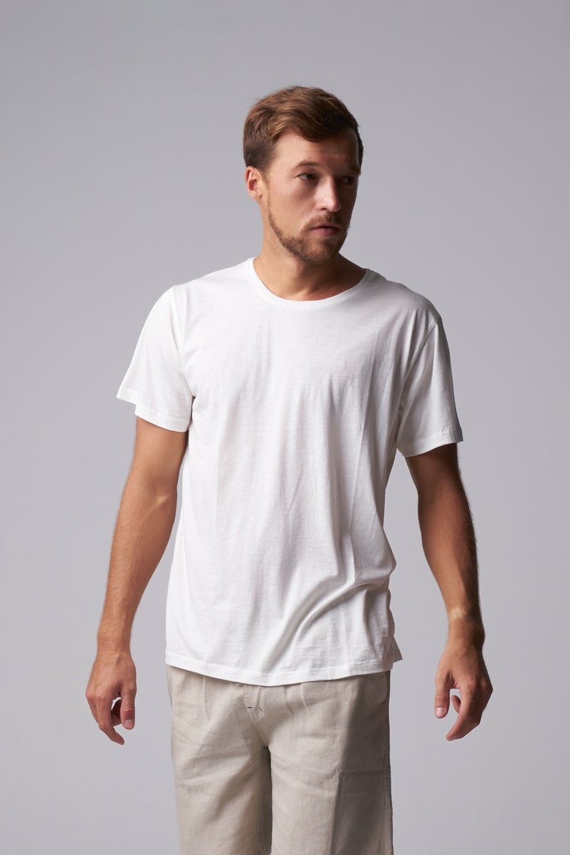 - A simple, solid linen t-shirt with a relaxed fit. It features a crew neck with V-shaped overstitching. The neck hole is just the right size, making this tee comfortable to wear. The solid linen fabric naturally offers breathability and flow. You can work it into casual, business casual, and streetwear looks. Handmade and designed in Bali.