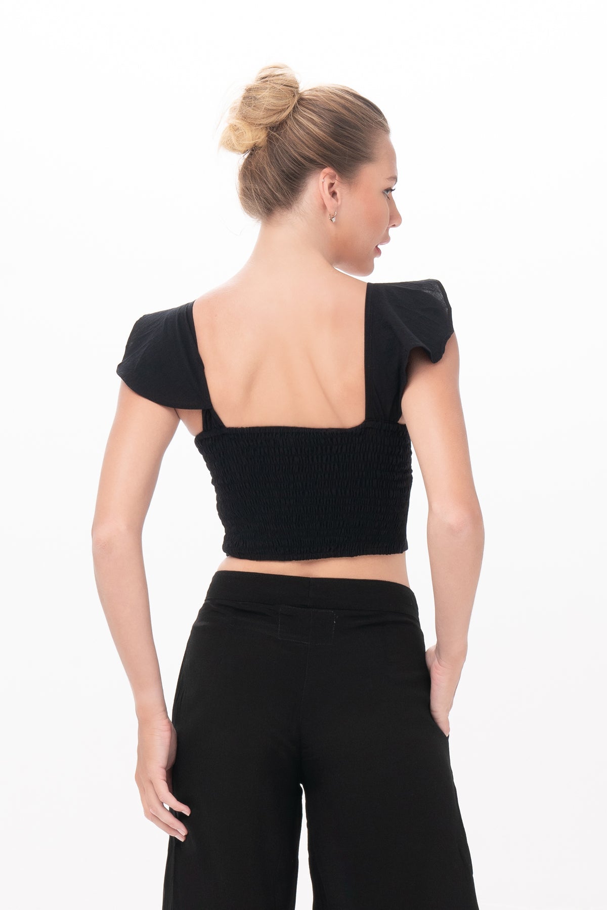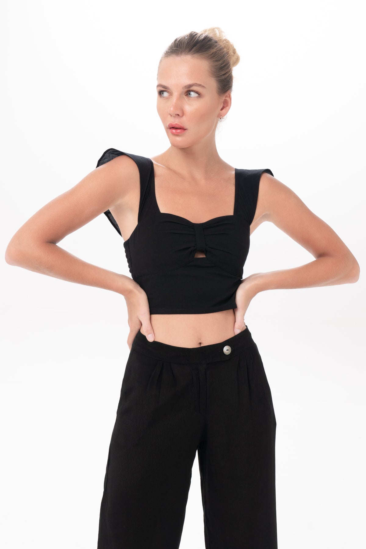 A fiercely feminine crop top with wide ruffled straps and bow-tie style front. It’s edgy but with a certain elegance. It can also be worn as an off-shoulder top. Handmade and designed in Bali.