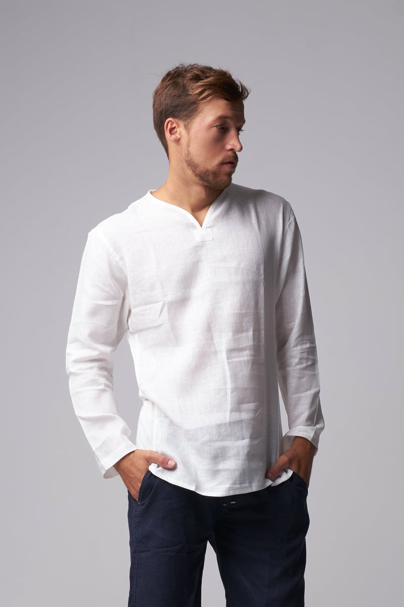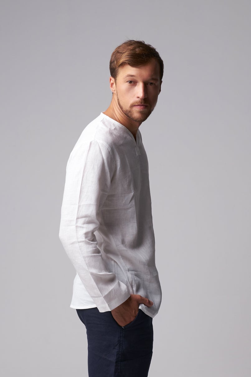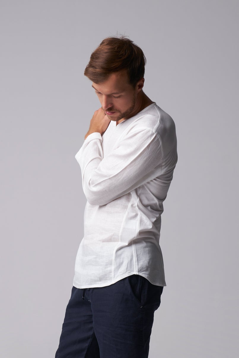 A well-constructed, relaxed-fit, long sleeve shirt for casual and business casual outfits. Made using organic fabric, the shirt offers comfort and breathability. It has a slightly curved v-neck, double side seams, and a curved hem. It can pair well with denim, cotton chinos, and linen pants. Handmade and designed in Bali.