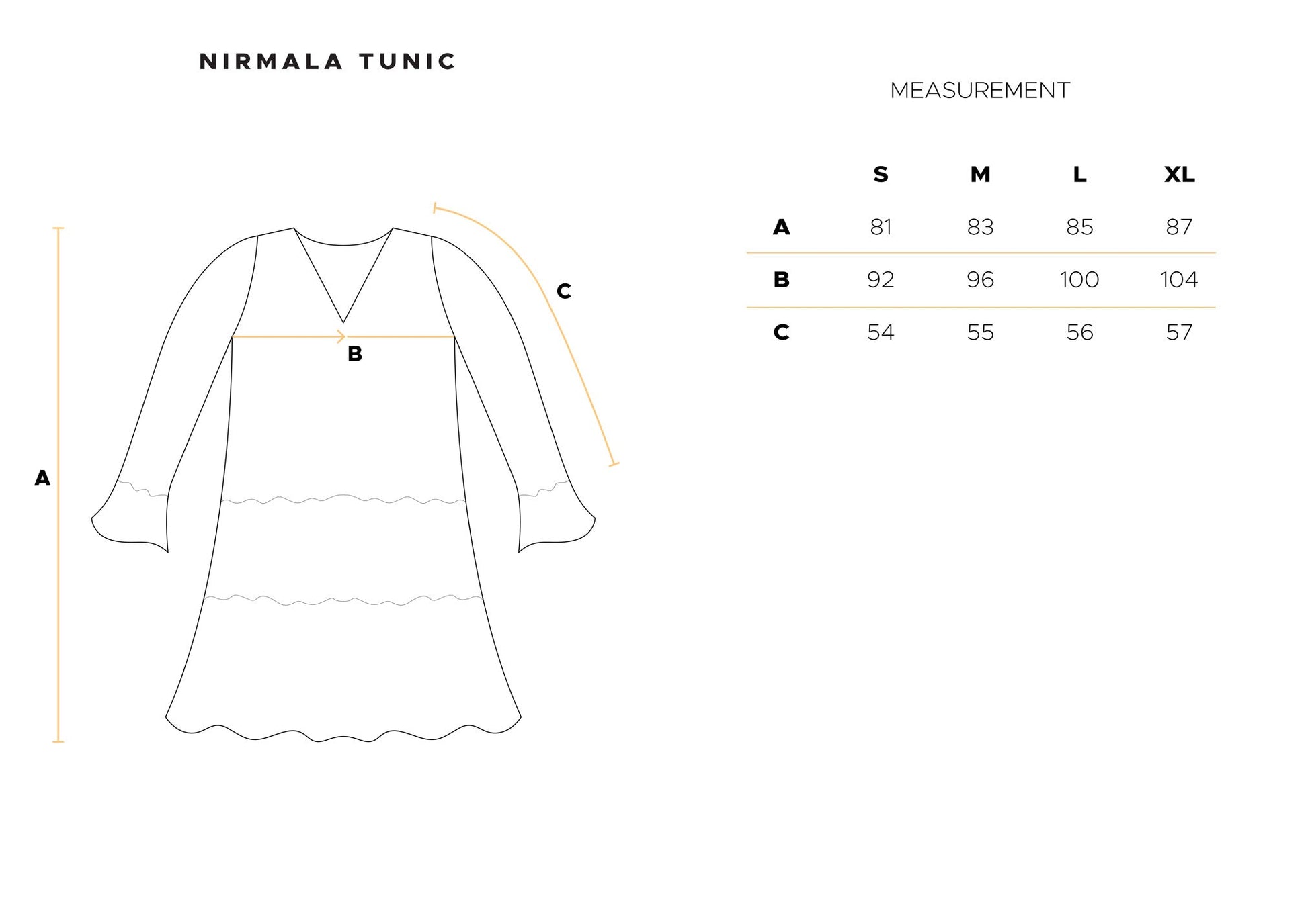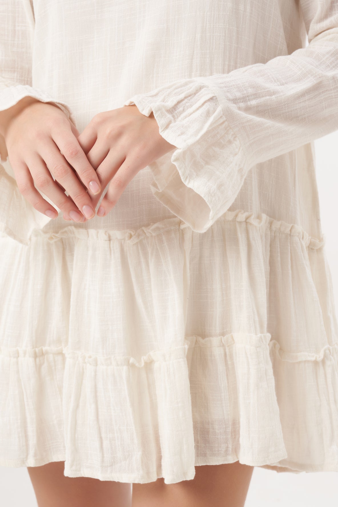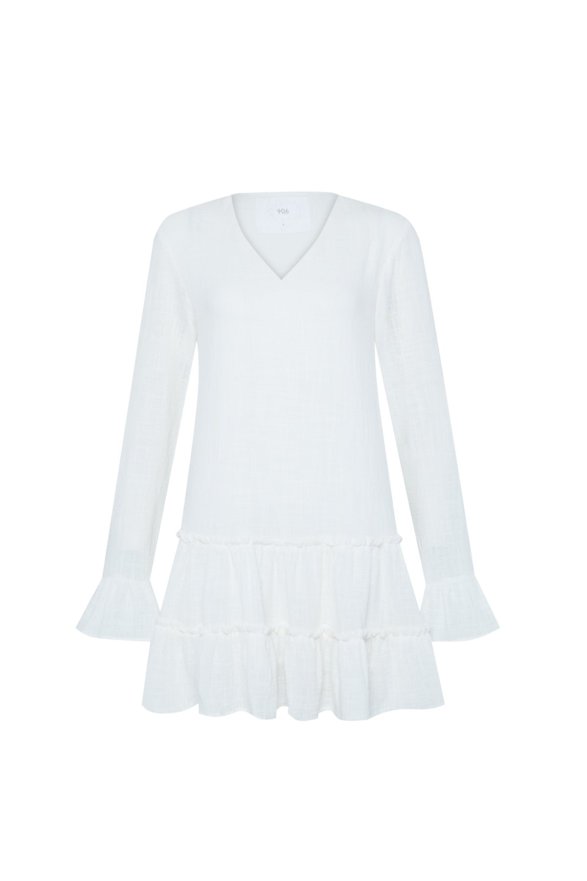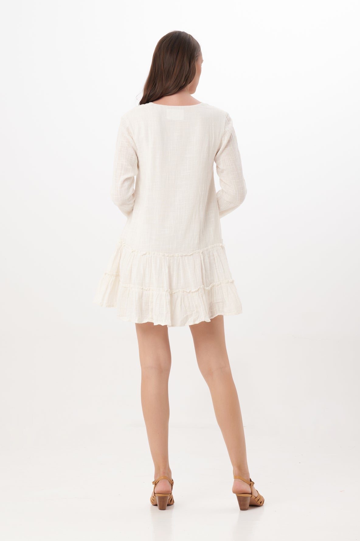 A flared tunic dress with a two-tier ruffled hemline and ruffles on the sleeve. The ruffles on the hem add movement to the silhouette. With a V-neck, this dress has a contemporary, relaxed fit. It’s perfect for day wear but can also work for evenings with some accessories. Handmade and designed in Bali.